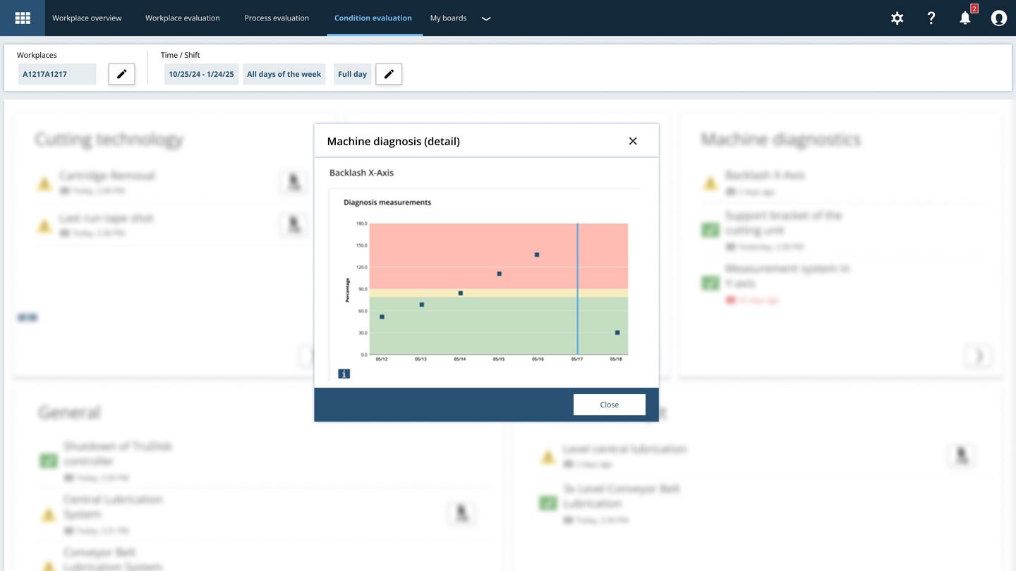 With the Condition Monitoring product, TRUMPF monitors your machine and gives you action recommendations based on a condition analysis in order to avoid malfunctions and machine downtimes. This information is no longer exclusively available in our service, but can now also be viewed directly by you via Smart View.