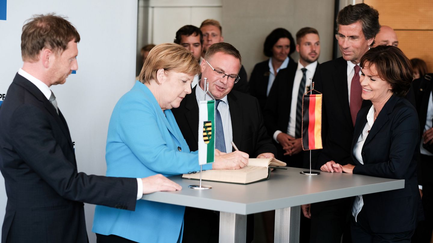 Bei einem Rundgang durch die Produktion informierte sich die Bundeskanzlerin über die Hightech-Maschinen und die Produktion von Automatisierungskomponenten in Neukirch. Im Anschluss nahmen Merkel und Sachsens Ministerpräsident Kretschmer an einer Diskussionsveranstaltung mit rund 250 anwesenden TRUMPF Mitarbeiterinnen und Mitarbeitern teil. Im Vorfeld sagte Nicola Leibinger-Kammüller in ihrer Rede: "Vielleicht ist es genau das, wonach sich die Menschen momentan am meisten sehnen: Politik zum Anfassen – Politik, die zuhört." Im Dialog mit den Mitarbeitern äußerte sich Merkel auch zur Fachkräftesituation in Sachsen: "Gegen den Fachkräftemangel muss die Politik den Rahmen setzen, damit die Unternehmen weiterhin erfolgreich arbeiten können".
