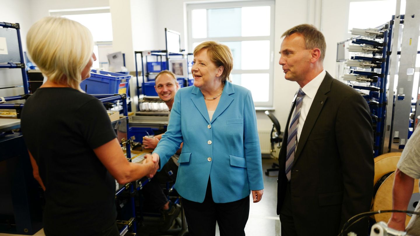 Am TRUMPF Standort in Neukirch informierte sich Bundeskanzlerin Angela Merkel über die Produktion von Hochtechnologiekomponenten und die Fachkräftesituation in Ostsachsen. Dabei lobte die Kanzlerin das Engagement von TRUMPF in der Region: "TRUMPF ist ein Beispiel, dass engagiertes Unternehmertum in Deutschland nach der Wende gelingen konnte."