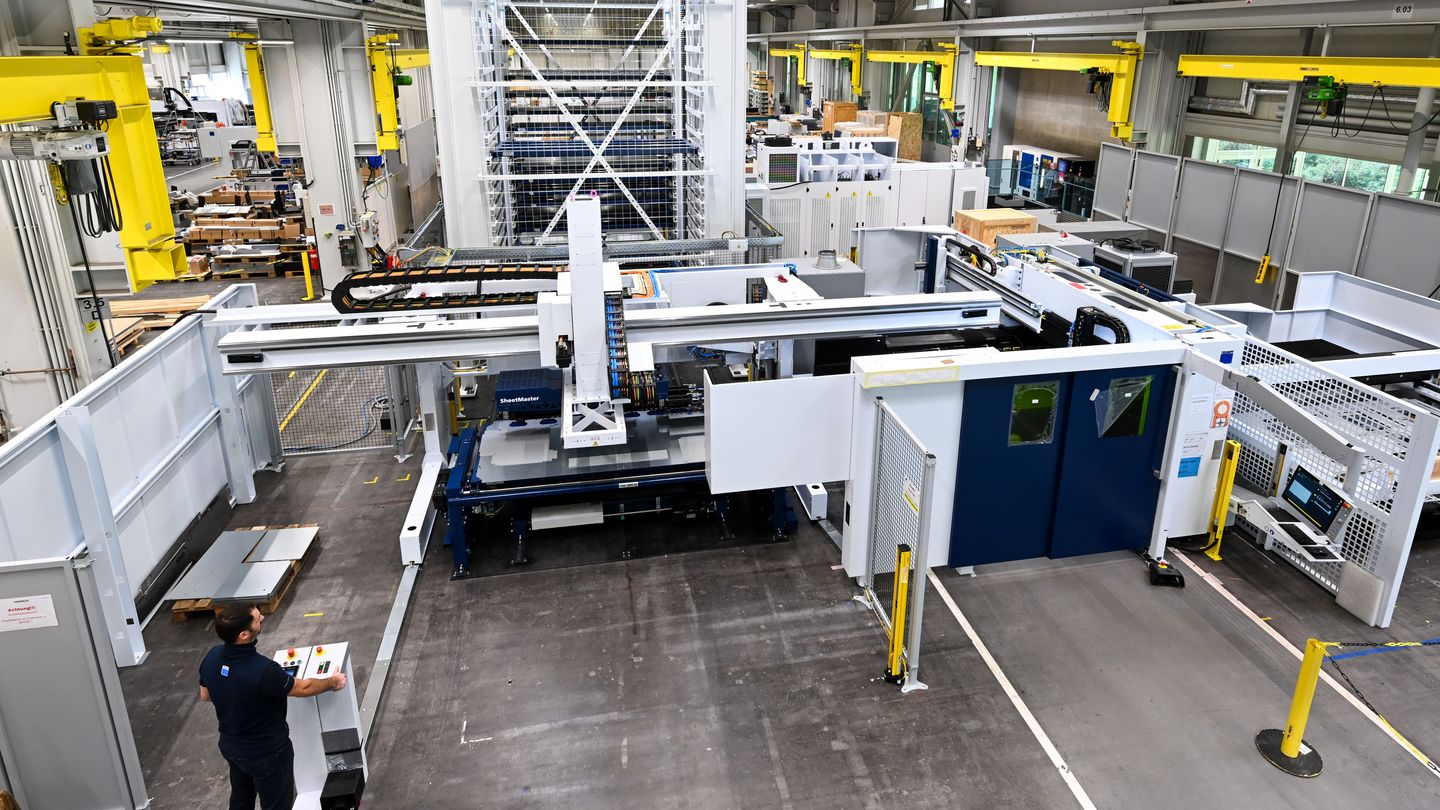 Auf der Blechexpo 2025 zeigt TRUMPF ein höchstproduktives Laser-Schneid-Stanz-Biege-Fertigungssystem, das über einen Materialpuffer von STOPA miteinander verkettet ist // Es kombiniert die Produktivität und Flexibilität von Einzelmaschinen mit den Vorteilen der Linienfertigung