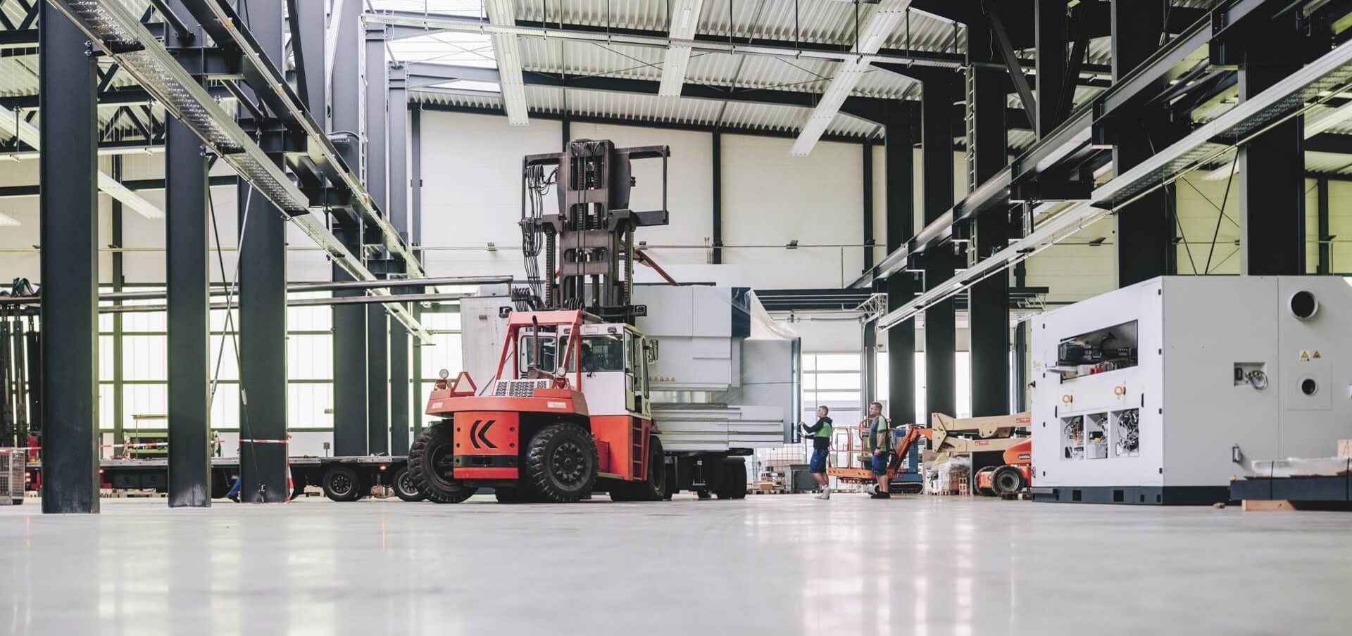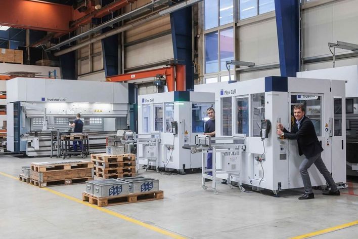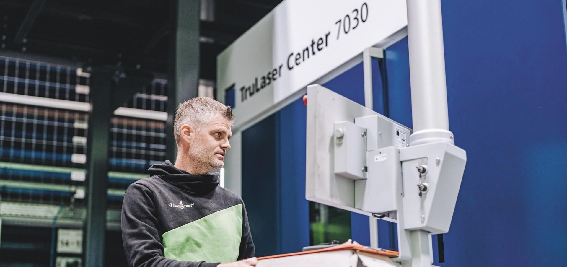 Heizomat hat auch an die Details gedacht: Die Halle überzeugt durch eine hocheffiziente Wärmeverteilung mit integrierter Beleuchtung. Auch das ist Teil des Konzepts: Ressourcenverbrauch nicht nur verlagern, sondern senken. Doch das Gebäude „denkt“ weiter. Die Fertigung ist automatisiert, die Steuerung intelligent vernetzt. Gemeinsam mit TRUMPF hat Heizomat den Maschinenpark geplant. Er umfasst mehrere Schweißzellen aus der Reihe TruArc Weld 1000, Biegemaschinen aus der Serie TruBend 5000 und 8000 und Laserschneidmaschinen wie die TruLaser 3030 und die TruLaser 5040 sowie das STOPA Großlager. Planen und steuern lässt sich das alles über die TRUMPF Software Oseon, die nahtlos mit dem firmeneigenen ERP kommuniziert, einer Software, die betriebliche Abläufe steuert. Material, Daten und Energie fließen zusammen – intelligent, effizient, durchgängig.