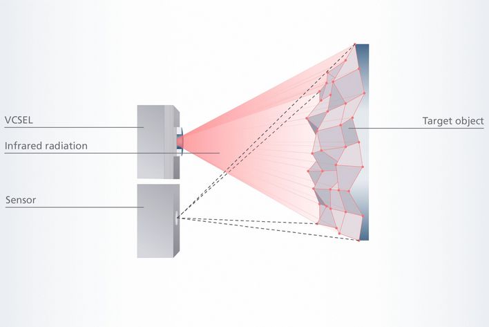 A dot pattern is projected onto a surface. The VCSEL laser light thus illuminates a target scene, enabling a sensor to capture the observed distortion and convert it into information about the third dimension of the illuminated object. This achieves extremely high accuracy, which is required for a sensor to support optical applications such as facial recognition.