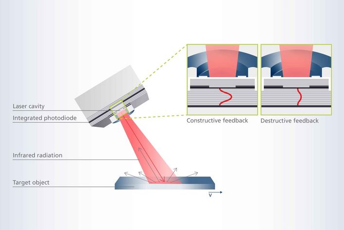 A single point of light is projected onto an object by a VCSEL. The object scatters the light back into the laser and interferes depending on the phase. The laser power is modulated by the feedback from the object. The modulated laser power is measured by the integrated photodiode. A modulated laser current can be used for simultaneous distance and velocity measurement.