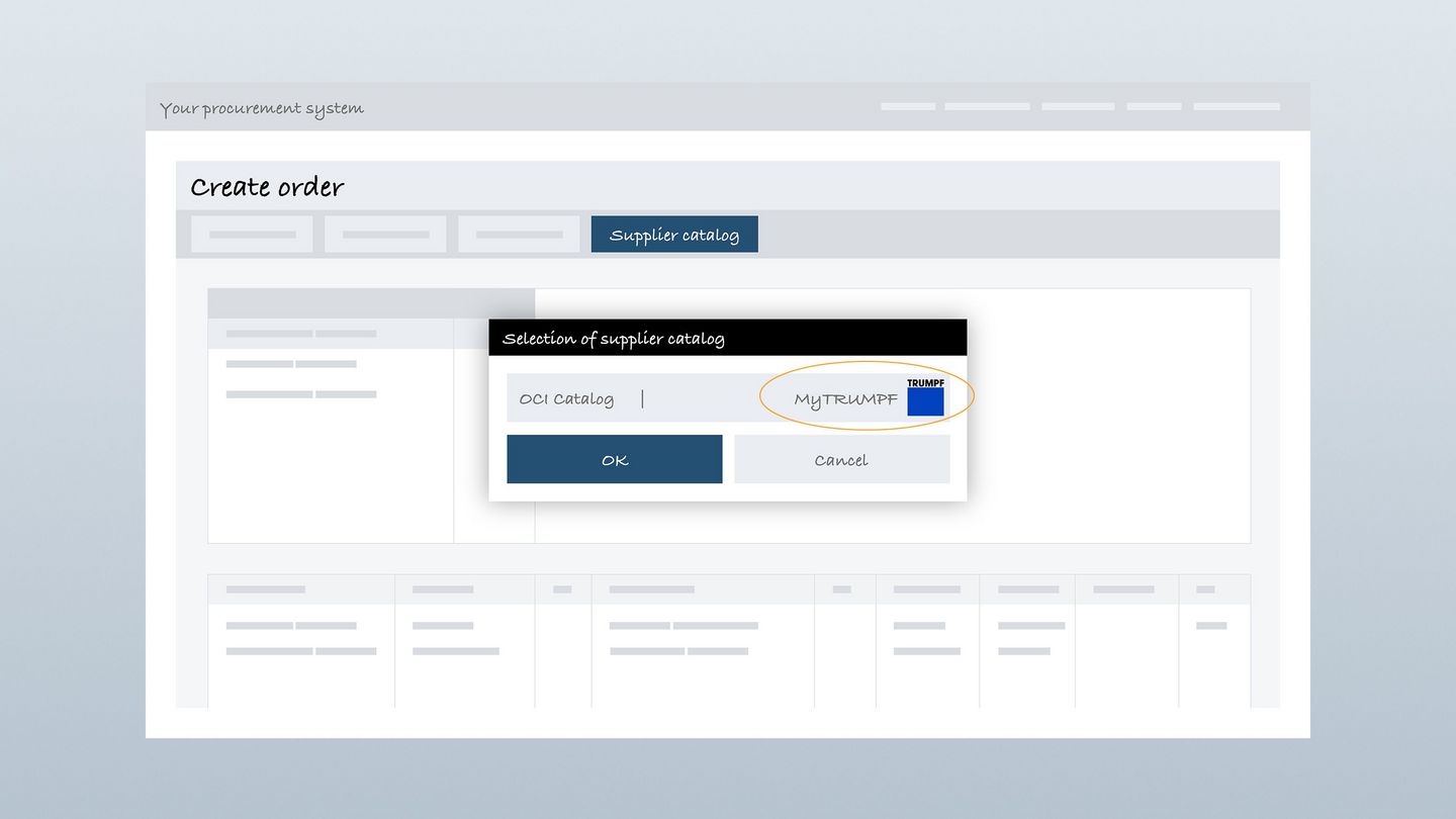 L'obiettivo di OCI consiste nell'utilizzare l'E-Shop MyTRUMPF per la selezione di ricerche e prodotti, nonché nell'integrare i dati dei prodotti nel sistema ERP, senza doverne archiviare manualmente ogni dettaglio. Le informazioni sui prodotti vengono integrate nel processo di ordinazione tramite l'interfaccia OCI; la trasmissione degli ordini e la contabilizzazione si svolgono poi direttamente nel sistema ERP del cliente.