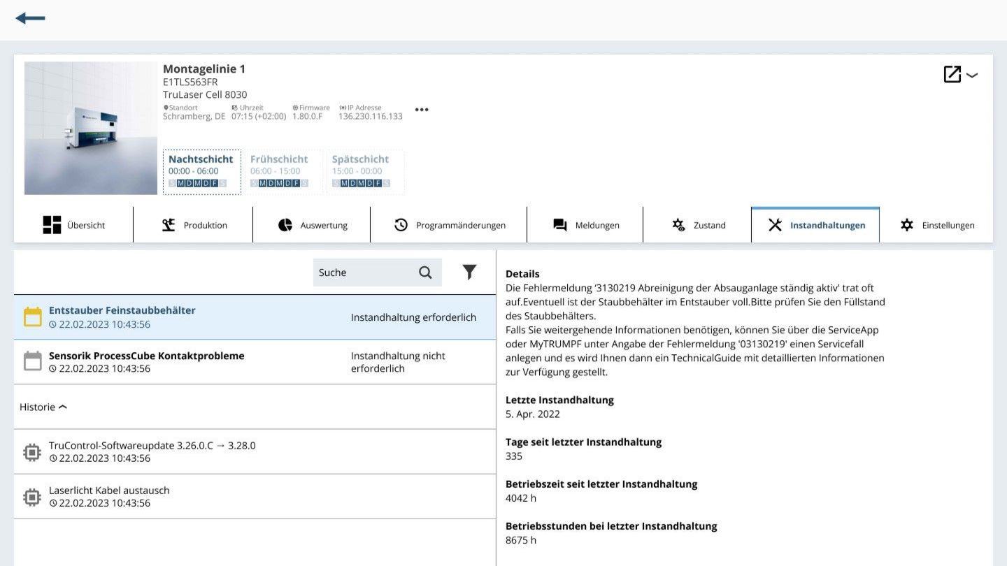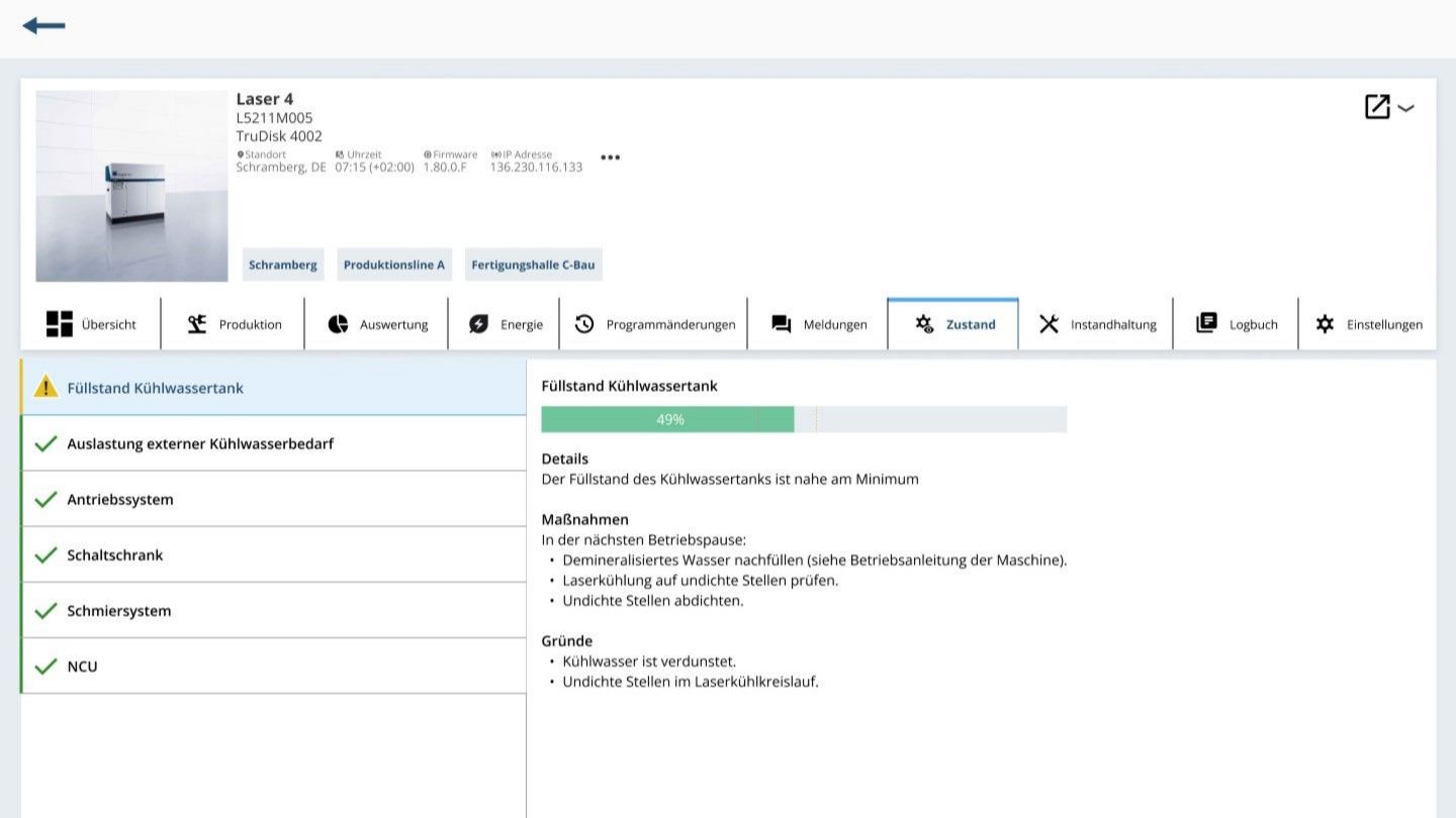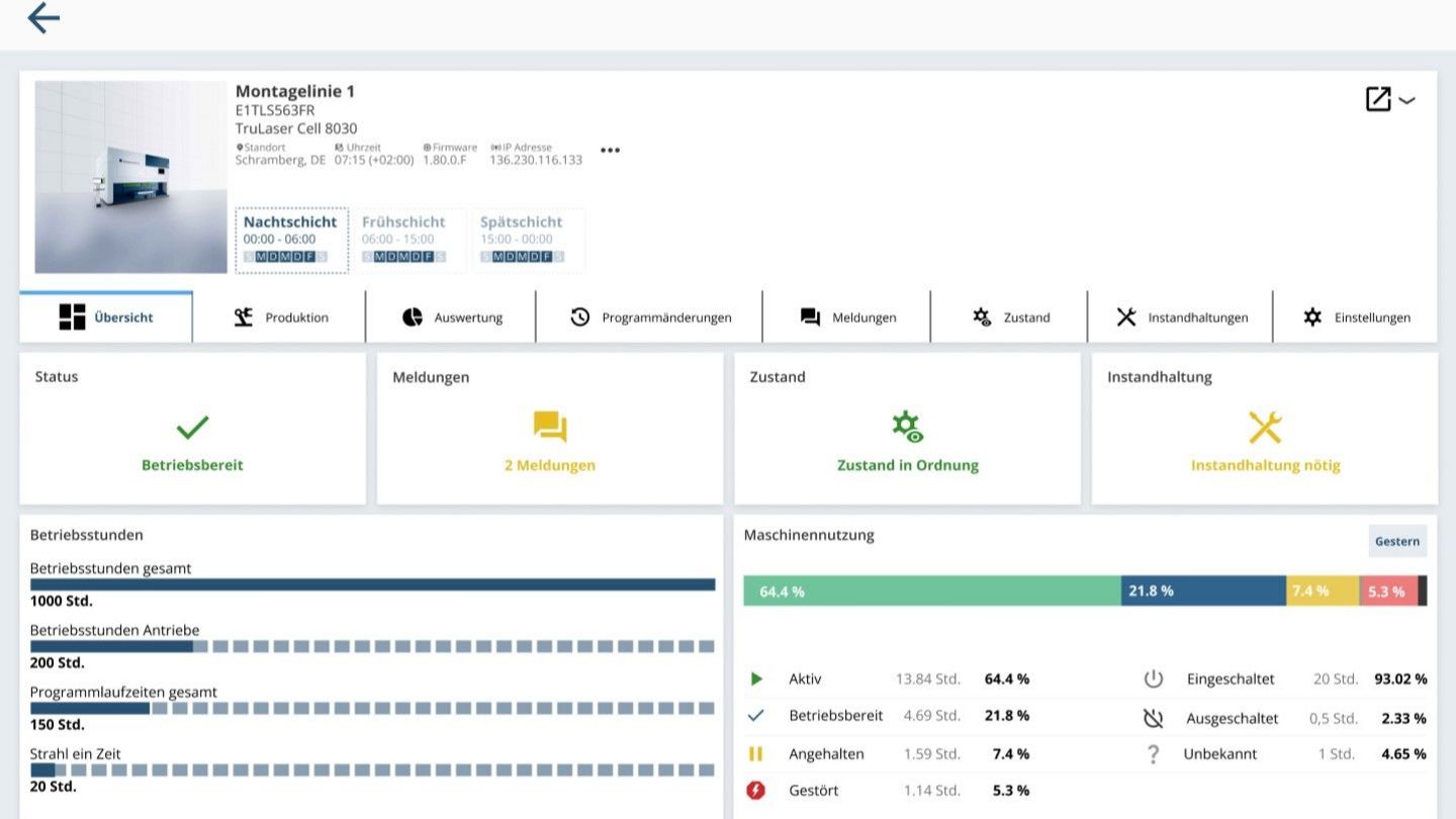 Potete accedere, se necessario, anche a viste più dettagliate. In questo modo è possibile visualizzare dashboard con le condizioni di stato, con una massima trasparenza in relazione ai dati avanzati dei dispositivi, le segnalazioni di errore verificatesi, le sollecitazioni dei dispositivi, gli interventi di manutenzione previsti e le modifiche eseguite dei programmi dei laser e dei sistemi laser.