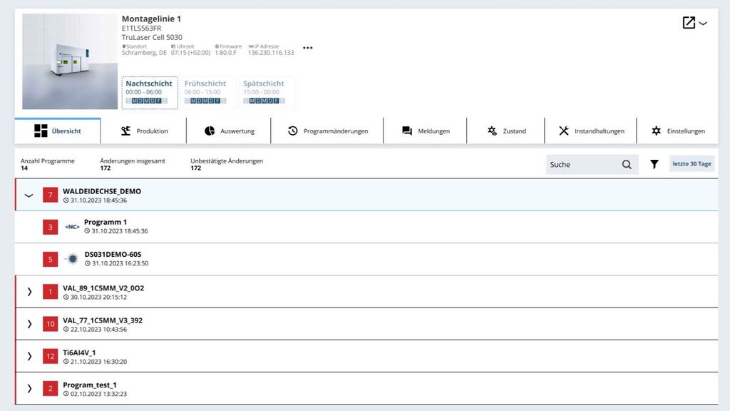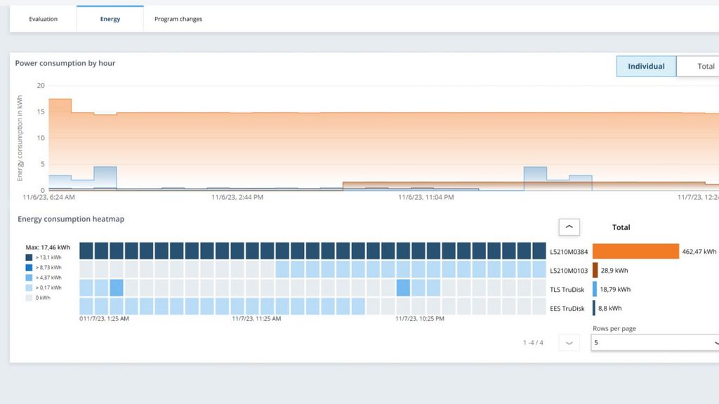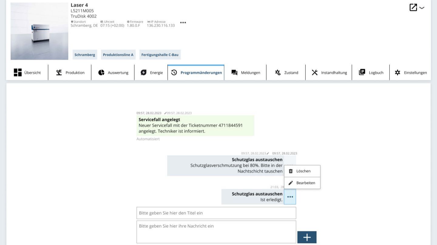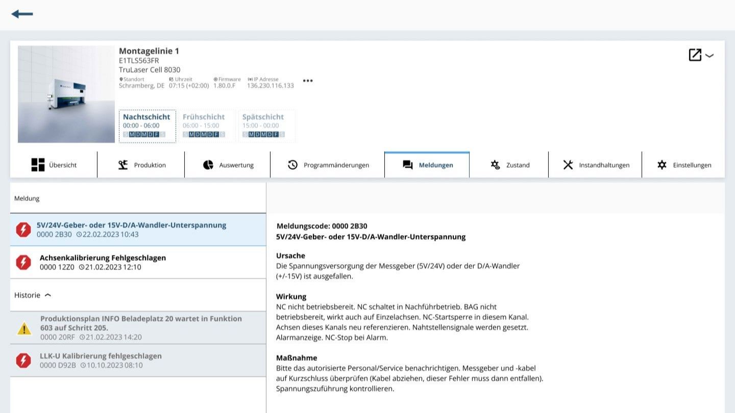 Potete accedere, se necessario, anche a viste più dettagliate. In questo modo è possibile visualizzare dashboard con le condizioni di stato, con una massima trasparenza in relazione ai dati avanzati dei dispositivi, le segnalazioni di errore verificatesi, le sollecitazioni dei dispositivi, gli interventi di manutenzione previsti e le modifiche eseguite dei programmi dei laser e dei sistemi laser.