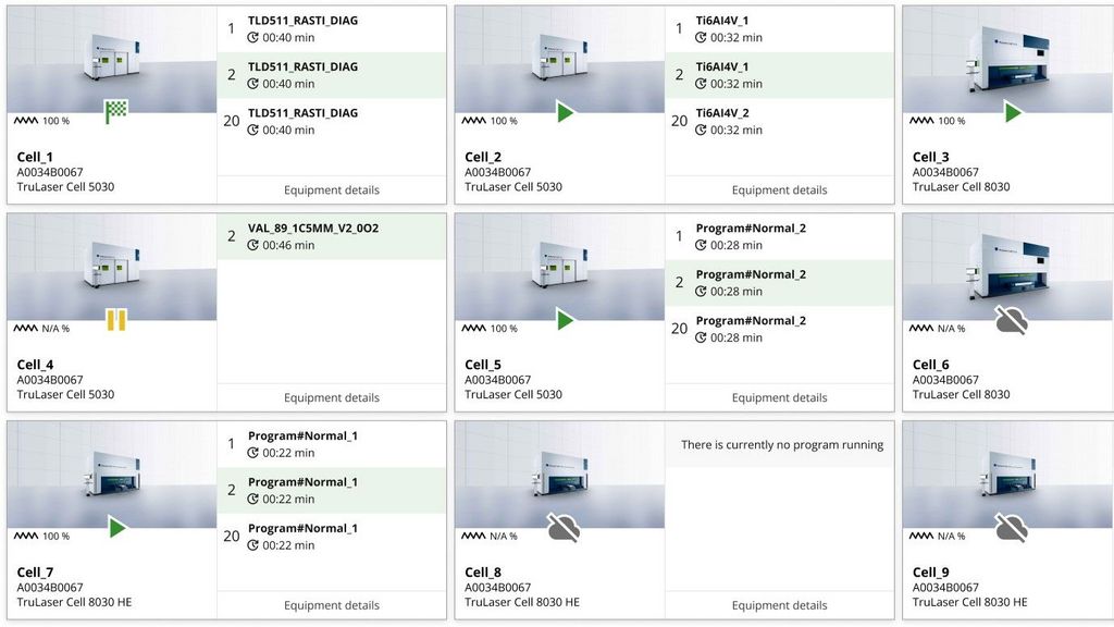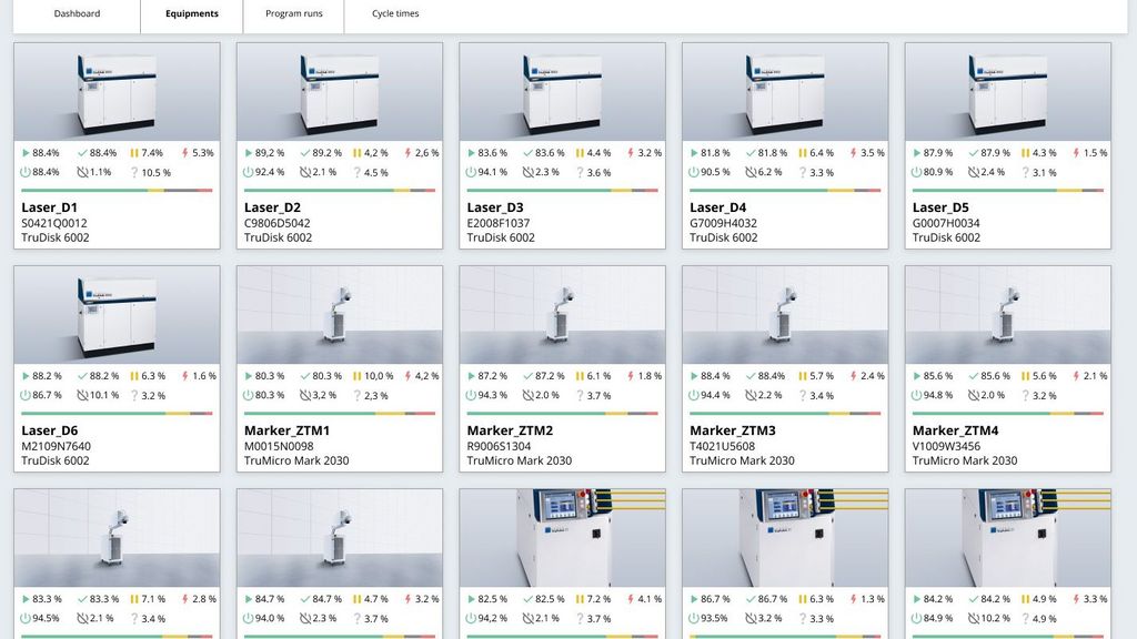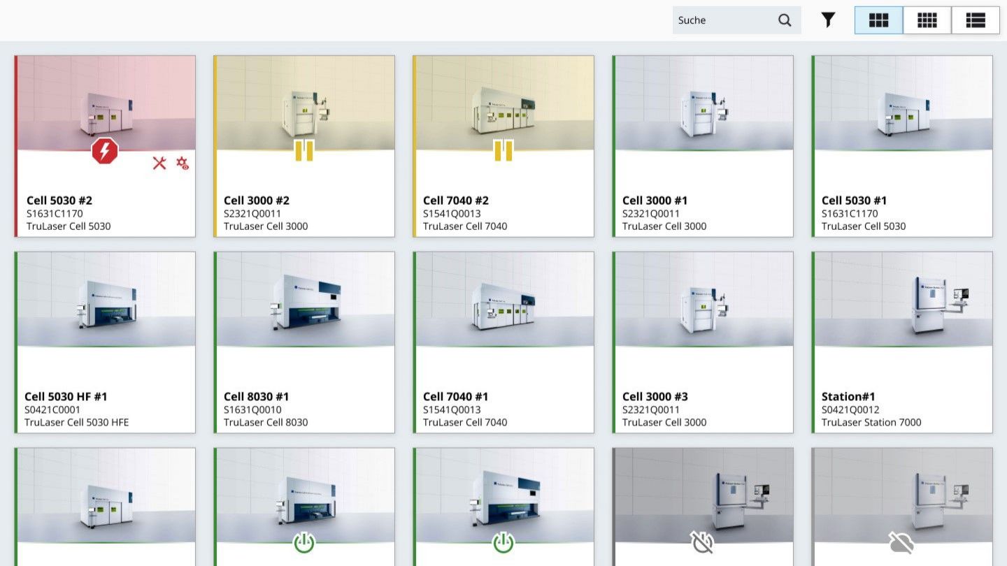 Tutto sotto controllo: con la pagina panoramica tenete sempre sotto controllo lo stato del laser o del sistema laser. Da qui potete passare alla vista dettagliata di ogni dispositivo. Nel modulo Overview vengono inoltre riassunte le informazioni relative ad altri moduli aggiunti, come ad esempio Production e Quality.