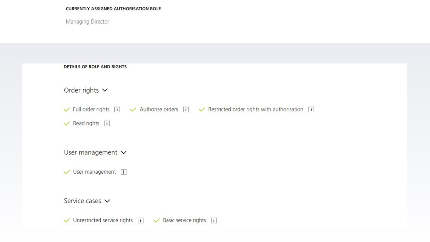 Com a função de administrador empresarial no MyTRUMPF, pode atribuir funções com diferentes níveis de permissão aos seus funcionários. Assim, é possível respeitar os processos de validação específicos da empresa. As funções influenciam as permissões no MyTRUMPF, na E-Shop da TRUMPF e na Service App. Duas funções possuem ainda direitos administrativos, para atribuir funções aos funcionários ou alterá-las, bem como convidar colegas para o MyTRUMPF e validá-los.