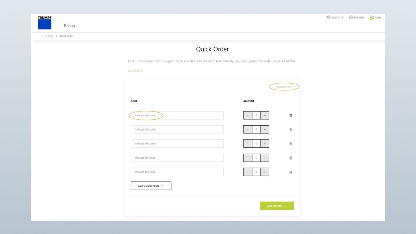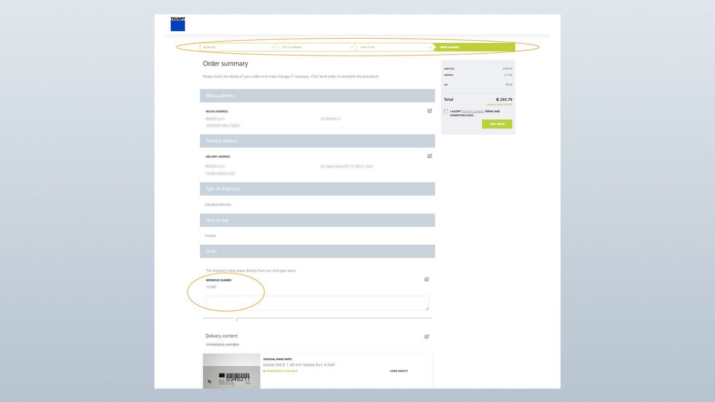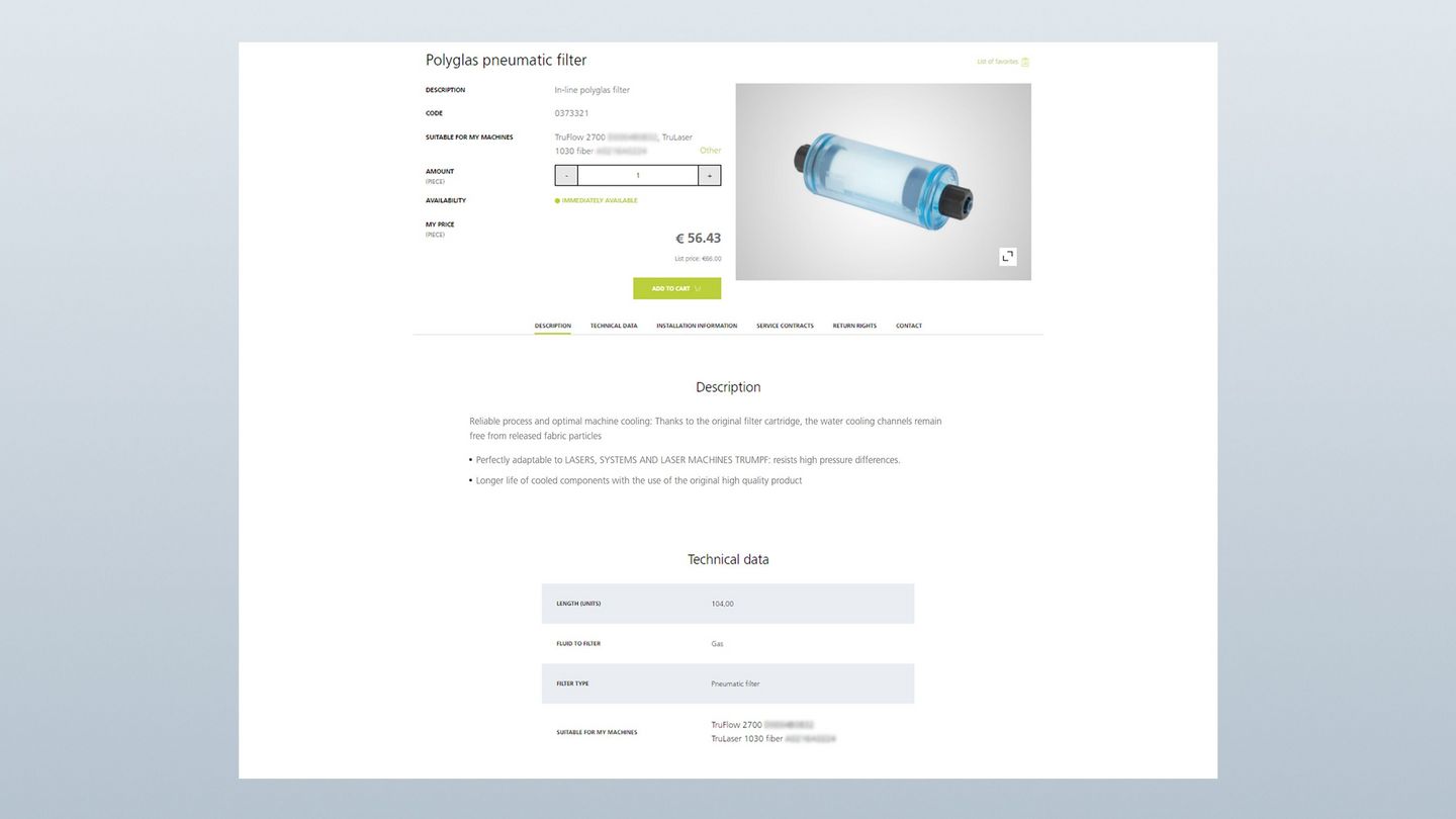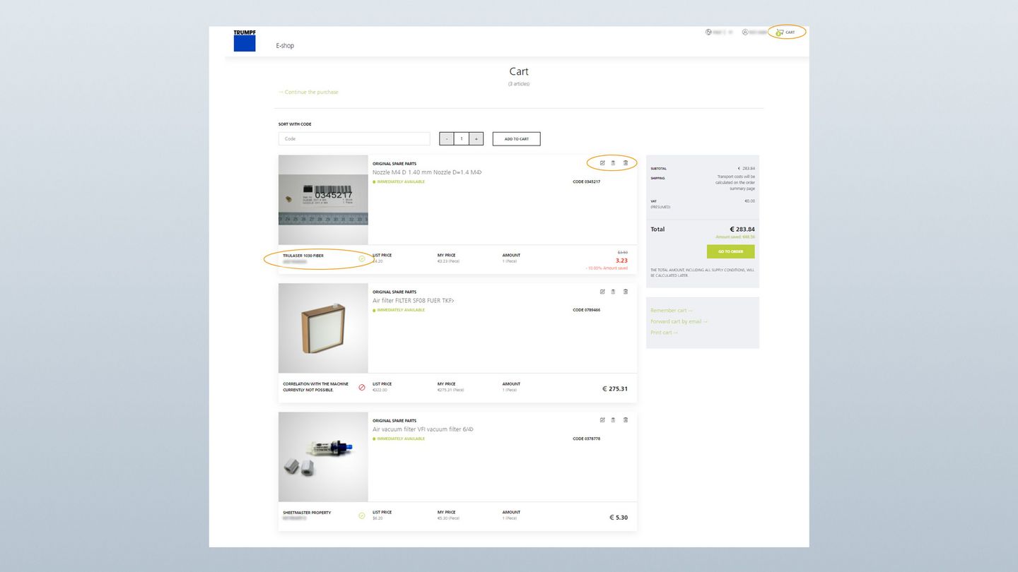 Objednejte své originální díly pohodlně přes e-shop TRUMPF. S mnoha inteligentními funkcemi se e-shop přizpůsobí vašim strojům a potřebám. Můžete si být jistí, že objednáte pro své stroje vždy správné díly. Naučte se s naší uživatelskou příručkou krok za krokem, které funkce e-shop TRUMPF nabízí a jak rychle, jednoduše a efektivně zadáte své objednávky.