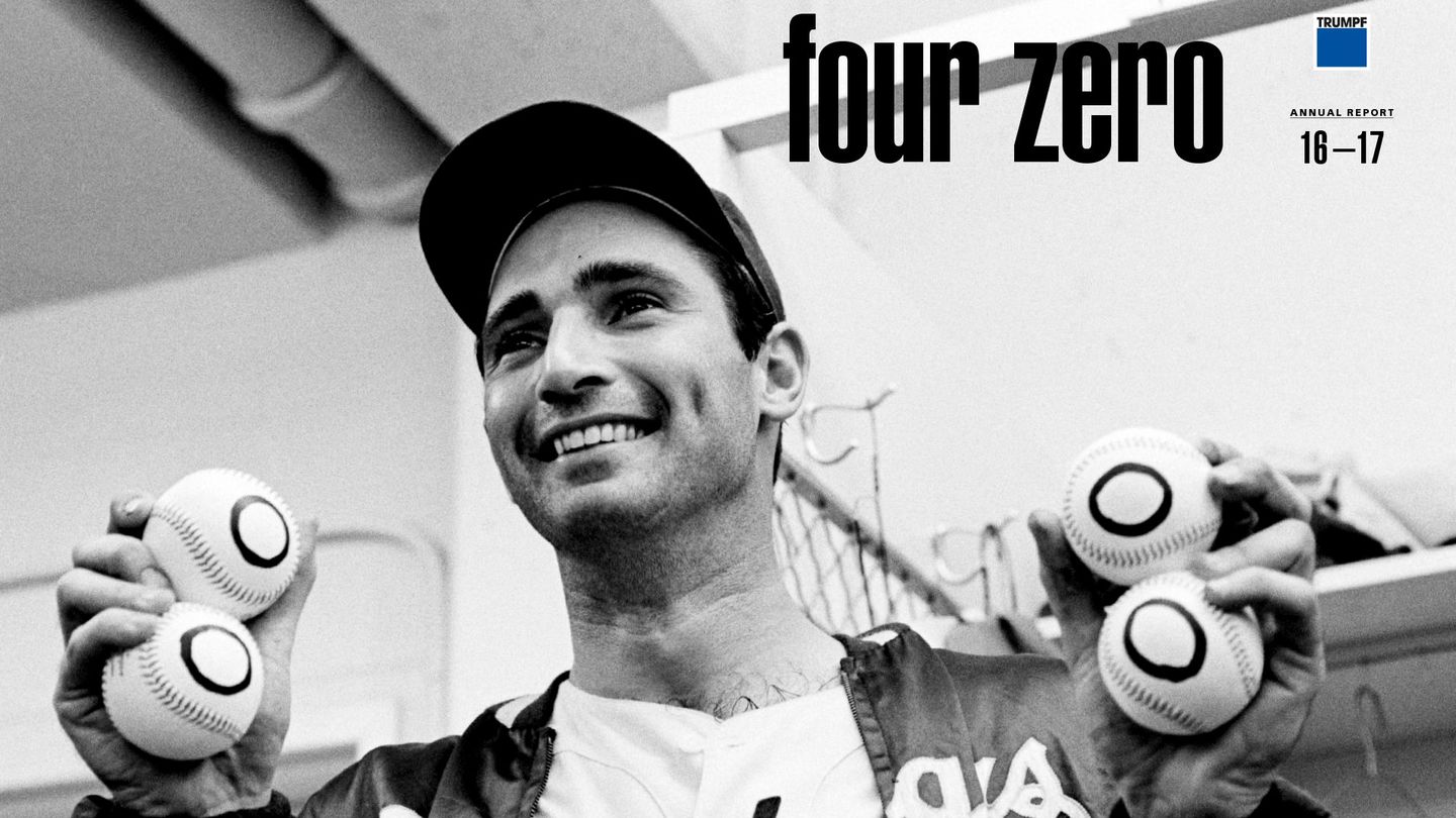 Již v září společnost TRUMPF informovala o otevření demo závodu v Chicagu pro prezentaci výsledků dosažených v rámci iniciativy Průmysl 4.0. Investice do budov a technického vybavení v Chicagu činily 26 milionů EUR. Také nová zpráva o hospodaření se zaměřuje na USA, na jejíž obálce je fotografie ikony amerického sportu: hráče baseballu Sandy Koufaxe. Jemu se v průběhu jeho kariéry podařily čtyři takzvané "No Hitter" (vysv.: No Hitter - když nadhazovač v baseballu nedovolí soupeři za celý zápas jediný úspěšný odpal).