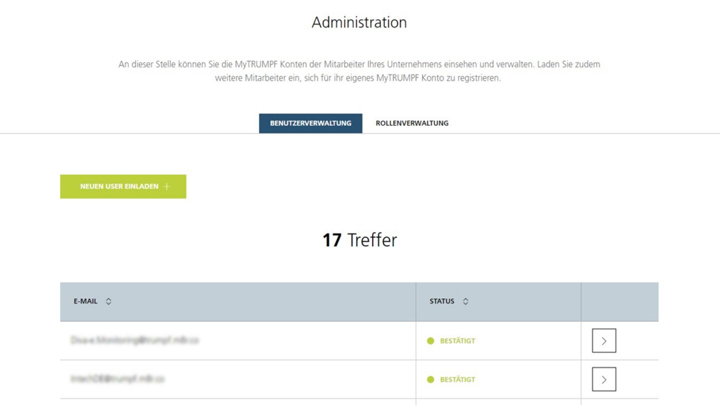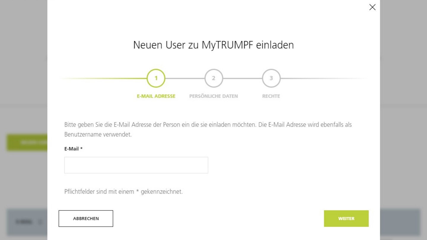 MyTRUMPF Benutzer mit entsprechender Rolle können Mitarbeiter über einen Einladungslink zu MyTRUMPF einladen. Dadurch entfällt dann die Prüfung durch TRUMPF und der Benutzer ist schnell einsatzfähig.
