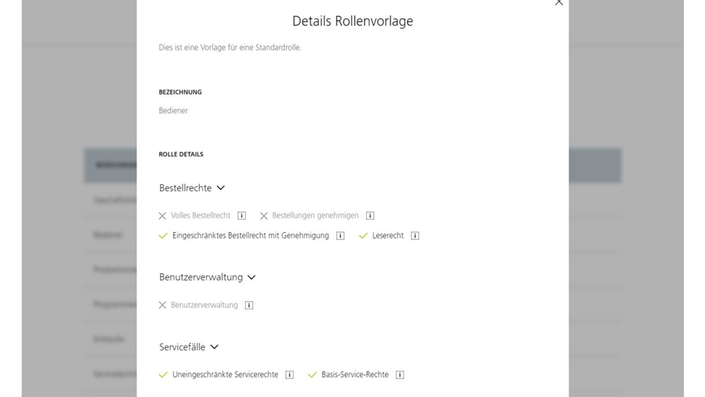Berechtigungen der Rolle "Bediener": Es liegt ein eingeschränktes Bestellrecht vor, jedoch volle Berechtigungen für das Servicefall-Management.