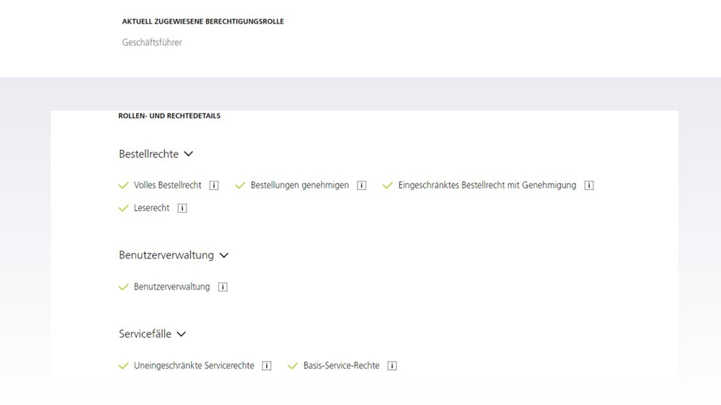 ** Diese Berechtigung wird nicht benötigt, da die Rolle die übergeordnete Berechtigung „Bestellen“ schon besitzt.