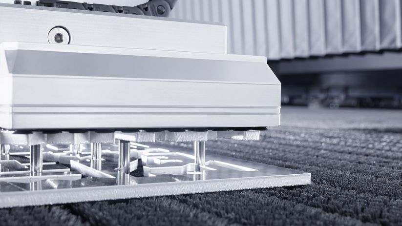 Die flexibel positionierbaren Pins des SmartLift drücken die freigeschnittenen Teile von unten gegen die Saugerplatte des SortMaster Speed. Gleichzeitig fixiert diese das Teil von oben. In einer synchronen Hubbewegung wird es so aus dem Restgitter gehoben. So sind selbst filigrane Teile sicher geklemmt und verkanten nicht im Schnittspalt.