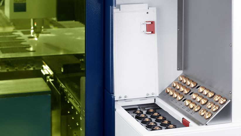 Programmgesteuert setzt der automatische Düsenwechsler die richtige Düse ein. Während der Bearbeitung befindet sich der Düsenwechsler im Maschinenschrank, dadurch wird ein hauptzeitparalleles Rüsten möglich.
