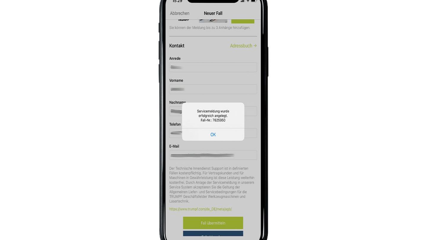 Melden Sie Servicefälle zu Ihren Maschinen oder Ihrer Software bequem und schnell per App. Die unternehmensweite Transparenz Ihrer offenen Servicefälle sorgt für eine reibungslose Schichtübergabe. Hinterlegen Sie dazu einfach einen anderen Kontakt, der von TRUMPF dann kontaktiert wird.