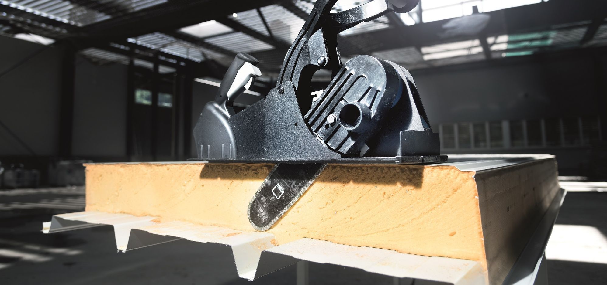 Mit dem Panel Cutter trennen Sie beispielsweise Dachpaneele und Wandelemente, maßgenau und rechtwinklig – in nur einem Arbeitsgang