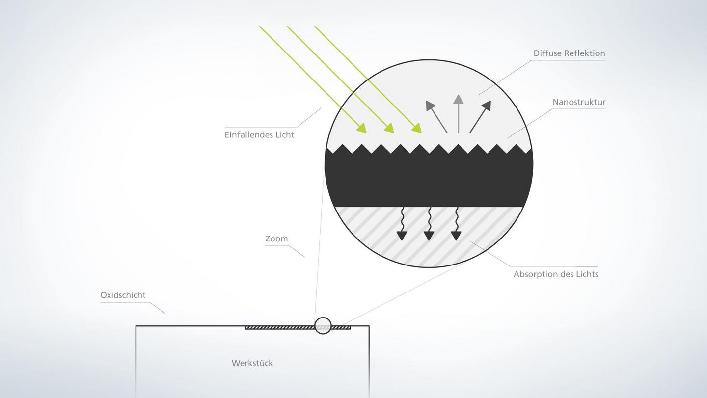 Black Marking ist ein Verfahren in der Laserbearbeitung, das zu einer äußerst dunklen, kontrastreichen Beschriftung der Oberfläche ohne Abtrag des Materials führt. Extrem kurze Laserpulse führen auf der Oberfläche zu Strukturen im Nanometerbereich. Die mikrostrukturierte Oberfläche sorgt dafür, dass die Streuung des Lichts reduziert wird und eine permanent tiefe und blickstabile Schwärzung der Markierung entsteht. Sind die zu dieser Beschriftung genutzten Laserpulse ultrakurz, bleibt die Farbänderung in bestimmten Parameterbereichen zudem korrosionsbeständig. Der Grund: Durch den Einsatz der Ultrakurzpulslaser ist die Wärmeeinflusszone äußerst klein und damit verbleibt ausreichend freies Chrom auf der Oberfläche, sodass sich eine selbstheilende Oxidschicht bilden kann.