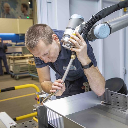 Gute Handschweißer zu finden ist selbst in der Hafenstadt Hamburg, der Wiege der Schweißer, kein leichtes Unterfangen. Erik Westphal, Produktionsleiter bei der Pfannenberg GmbH, erzählt: „Unsere Komponenten sind überwiegend aus Dünnblech gefertigt. Da sind Feinmotorik und eine ruhige Hand gefragt und Fachkräfte in diesem Bereich sind schwer zu finden.“ Hinzu kommt, dass das Schweißen der großen und schweren Gehäuse, auf den Rücken geht. Und auch das Schweißen von innen ist ergonomisch oft problematisch. Westphal sah sich daher nach einer Automatisierungsmöglichkeit für die Handschweißarbeitsplätze um.