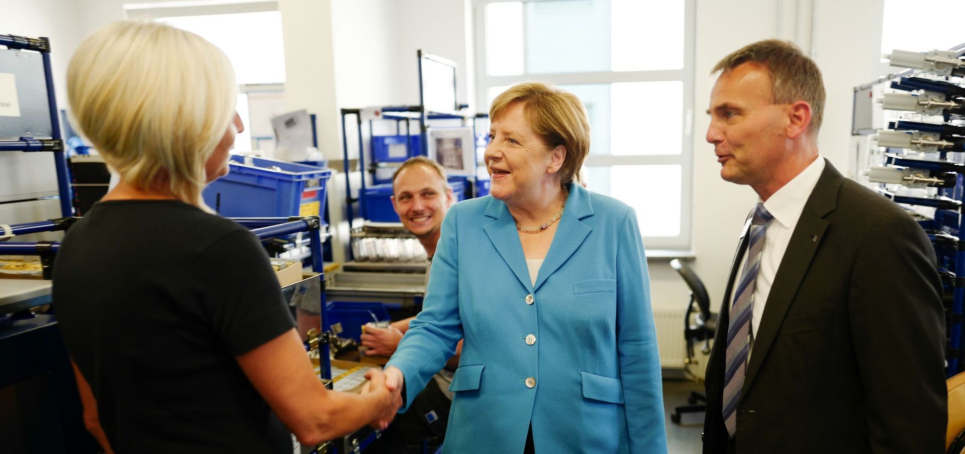 Am TRUMPF Standort in Neukirch informierte sich Bundeskanzlerin Angela Merkel über die Produktion von Hochtechnologiekomponenten und die Fachkräftesituation in Ostsachsen. Dabei lobte die Kanzlerin das Engagement von TRUMPF in der Region: "TRUMPF ist ein Beispiel, dass engagiertes Unternehmertum in Deutschland nach der Wende gelingen konnte."