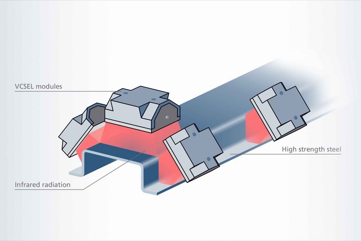 Tausende von Mikrolasern (VCSEL) sind auf einem einzigen Chip montiert. 56 dieser Chips sind auf jedem Emitter angebracht und mehrere Emitter werden auf einem Modul zusammengefügt. Die rechteckige Strahlungsfläche kann Millionen von Mikrolasern enthalten und mehrere kW infrarote Laserleistung abgeben. VCSEL Module erzeugen Nahinfrarotstrahlung mit einer Bestrahlungsstärke von 100 W/cm² in einem gerichteten, großflächigen rechteckigen Strahlquerschnitt. So wird eine präzise, lokale Wärmebehandlung ohne zusätzliche teure Laseroptiken oder Scannersysteme erreicht.