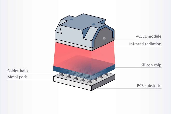 Das LAB-Verfahren verwendet einen Flip-Chip auf einer Leiterplatte und Lotkugeln als Verbindungen. Das VCSEL System erwärmt den Chip von oben, und die durch ein Siliziumplättchen übertragene Laserenergie schmilzt die Lotkugeln zwischen dem Chip und der Leiterplatte. So wird die Erwärmung größerer Bereiche einer kompletten Leiterplatte mit mehreren Chips ermöglicht – bei höherer Ausgangsleistung als bei anderen Lösungen.