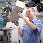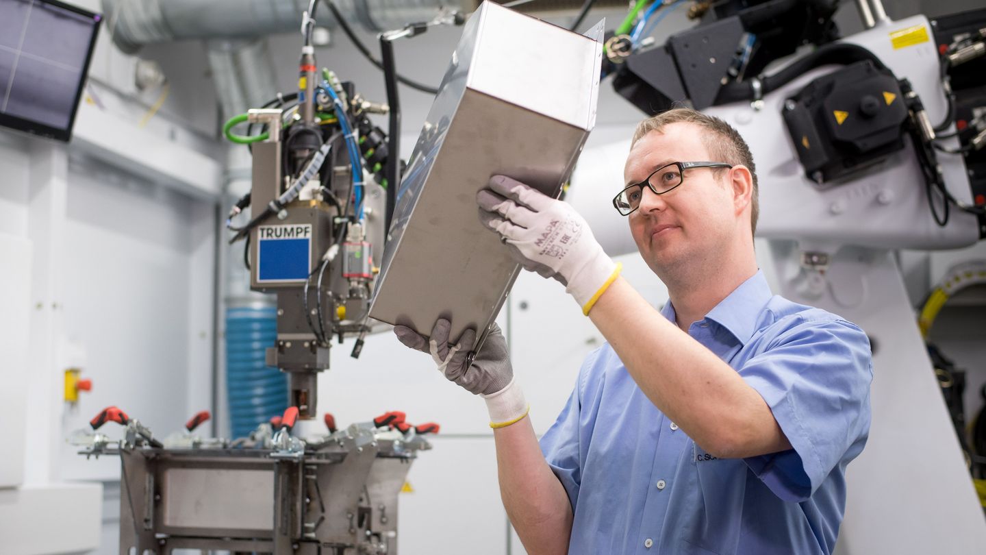 TRUMPF Applikationsingenieur im Laserlabor beim Schweißen einer Batteriewanne.