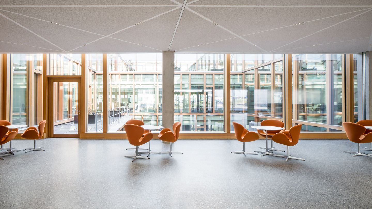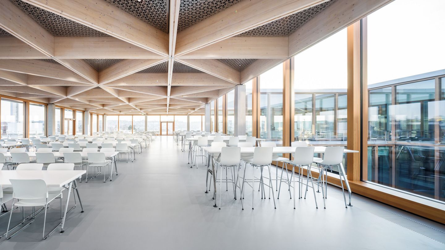 The architectural firm Barkow Leibinger from Berlin designed the building. "The highlight is the company restaurant. Creating such a high, atmospherically pleasant space, letting it tower so openly and permeably over the site, aligning everything with the reference to the outdoors and views of the landscape, providing restful acoustics under this far exciting wooden roof - these are all signs of TRUMPF's appreciation for its employees, which we were only too happy to translate into architecture," says architect Regine Leibinger. The building stands on an area of 60 by 60 meters in a ring around an inner courtyard. As a result, there is daylight in all the rooms, which are distributed over four floors, three above ground and one below. On the top floor, the open wooden beam structure with its triangular basic structure characterizes the space. This is where the company restaurant for all employees at the site is located, with seating for around 420.