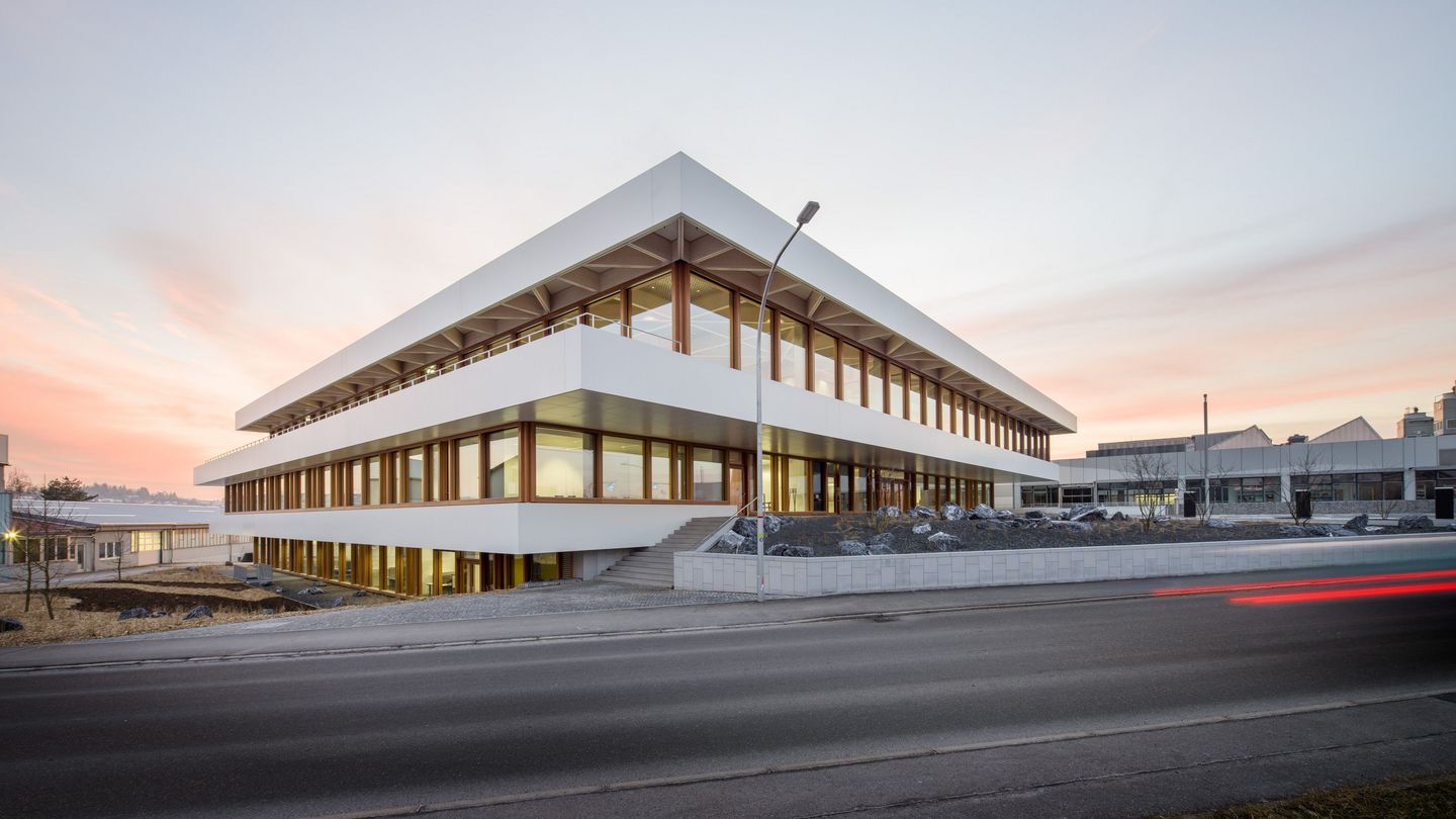 The facade of the multifunctional building consists of a wood-glass structure with horizontal steel bands approximately 1.60 m high. Since the floor slabs are offset from one another, the view creates an interplay between cantilevers, parapet bands and generous terrace areas.