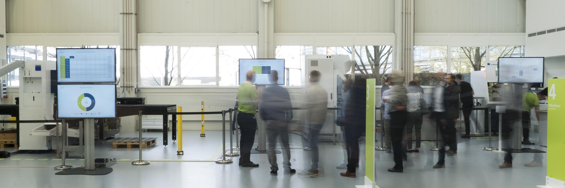 The way that digitalization makes processes easier was also demonstrated in a tour of the TRUMPF in-house sheet metal processing unit. Before the visitors get to see the first machine, they all meet in the green area, the place where the workers meet every morning to coordinate the day’s orders. Various screens show live production information and analyses of the machine utilization of the day before.