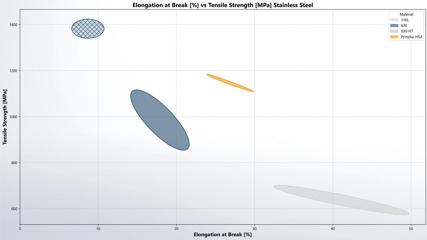 Diagram illustrating the elongation at break in relation to the tensile strength of stainless steel - a key indicator of mechanical properties in additive manufacturing.