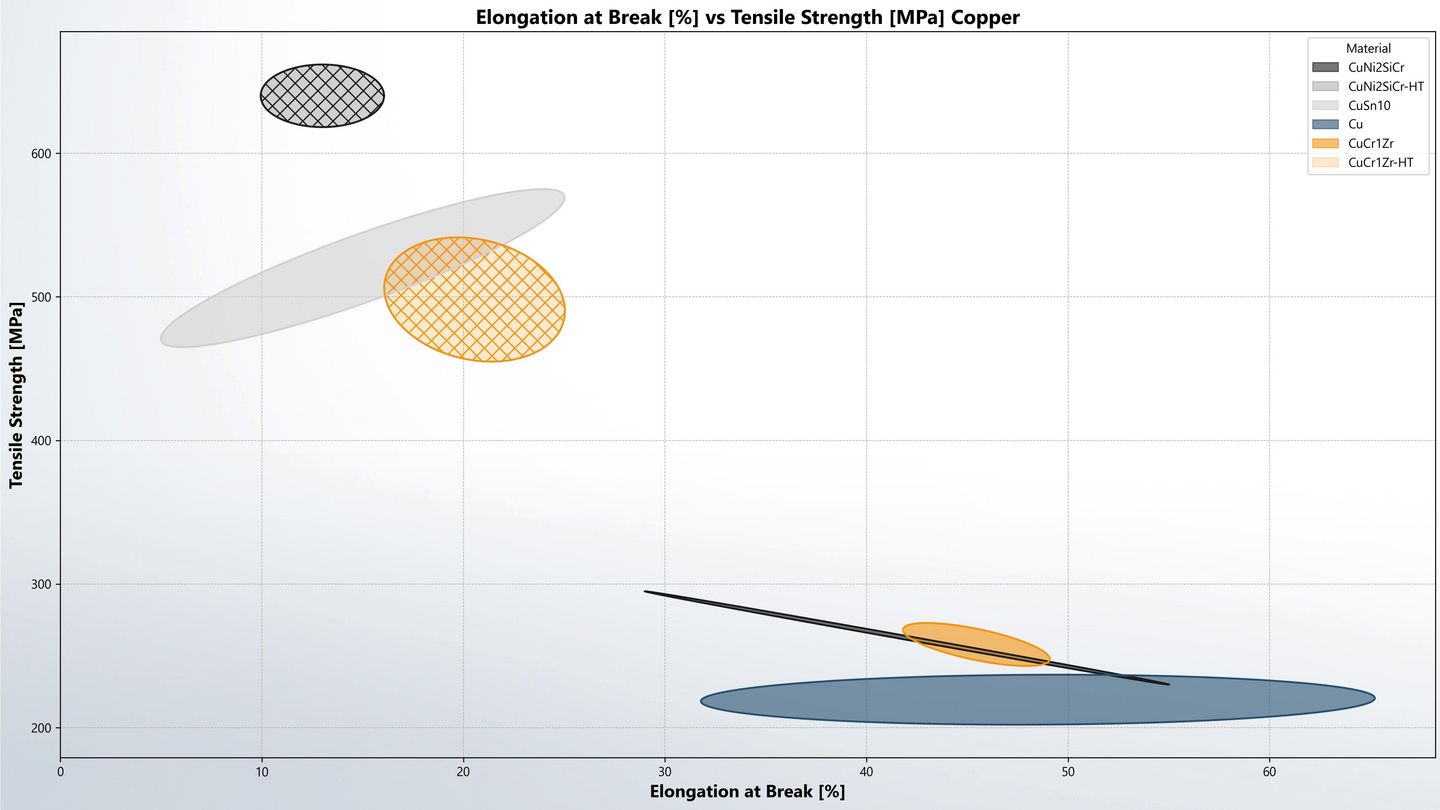 Diagram illustrating the elongation at break in relation to the tensile strength of copper - a key indicator of mechanical properties in additive manufacturing.