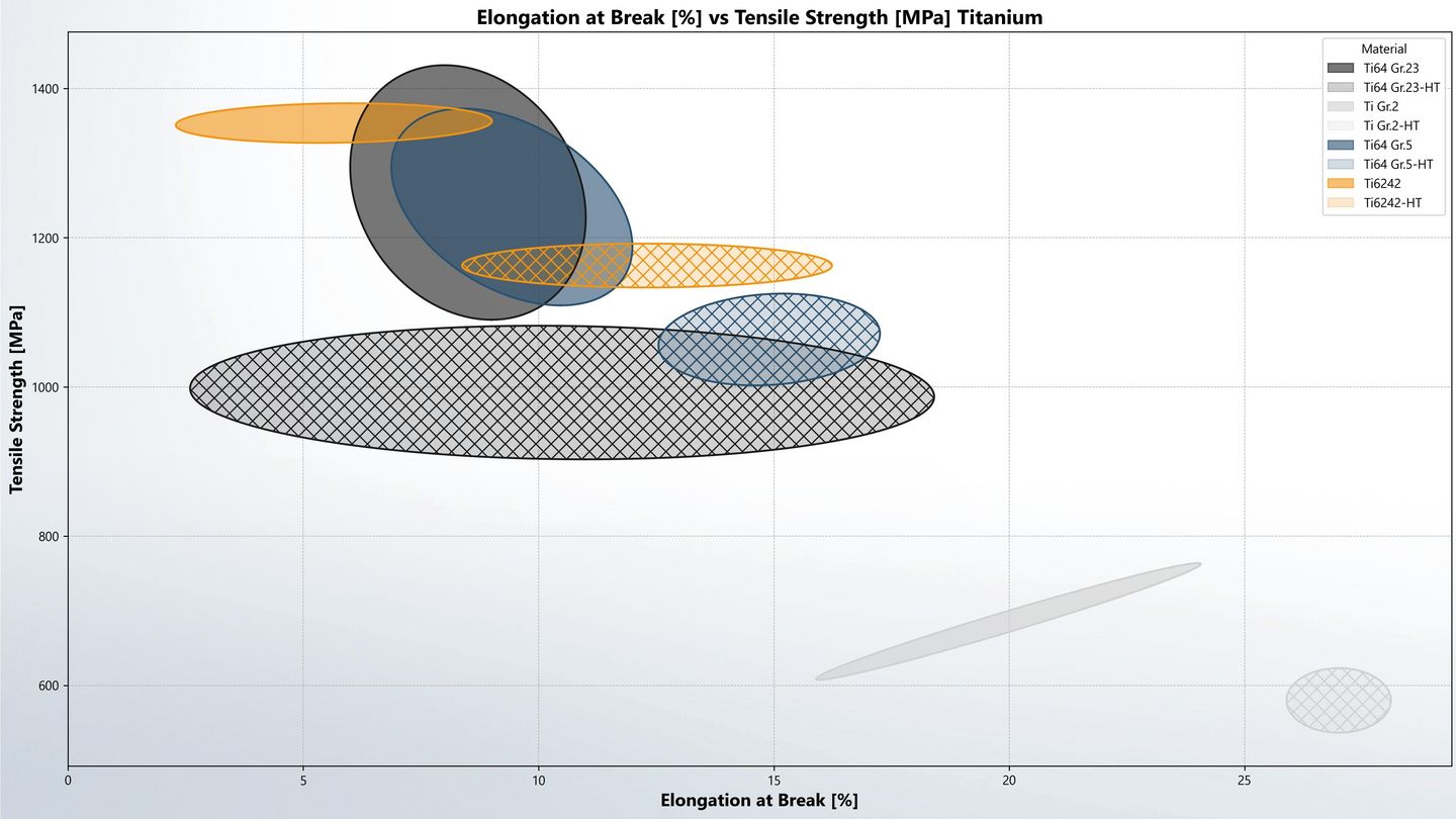 Diagram illustrating the elongation at break in relation to the tensile strength of titanium - a key indicator of mechanical properties in additive manufacturing.