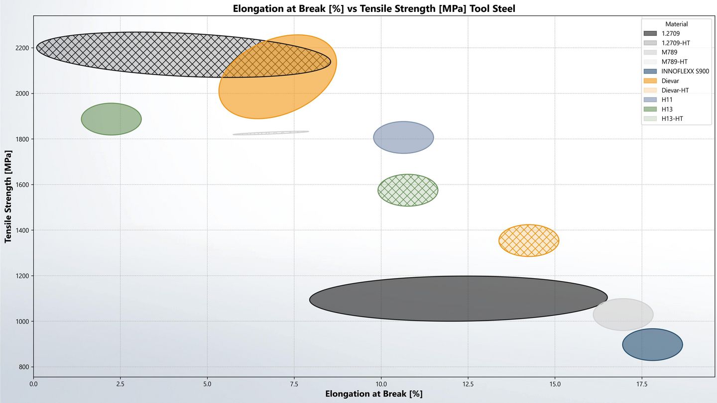 Diagram illustrating the elongation at break in relation to the tensile strength of tool steel - a key indicator of mechanical properties in additive manufacturing.