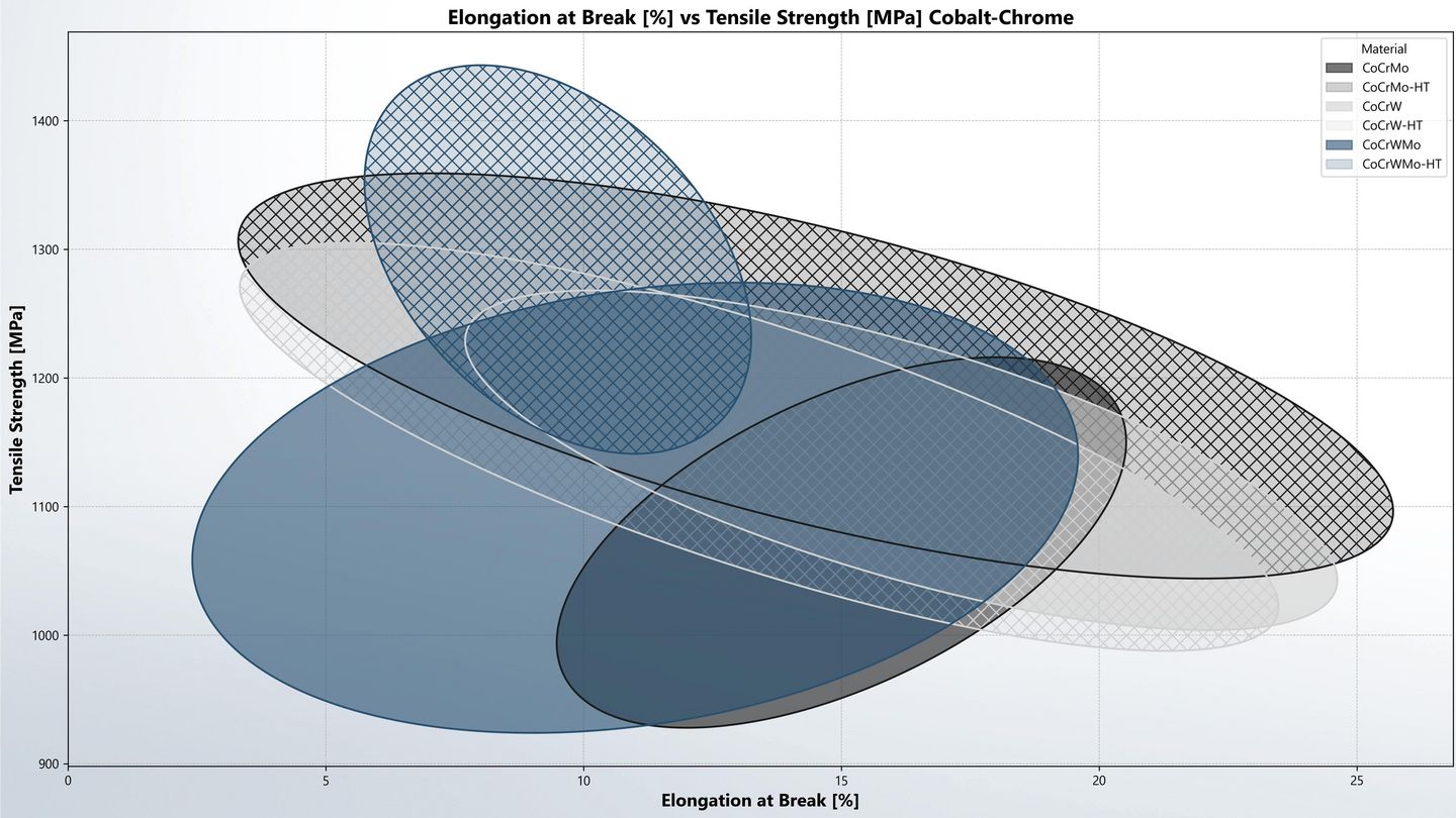 Diagram illustrating the elongation at break in relation to the tensile strength of cobalt-chromium - a key indicator of mechanical properties in additive manufacturing.