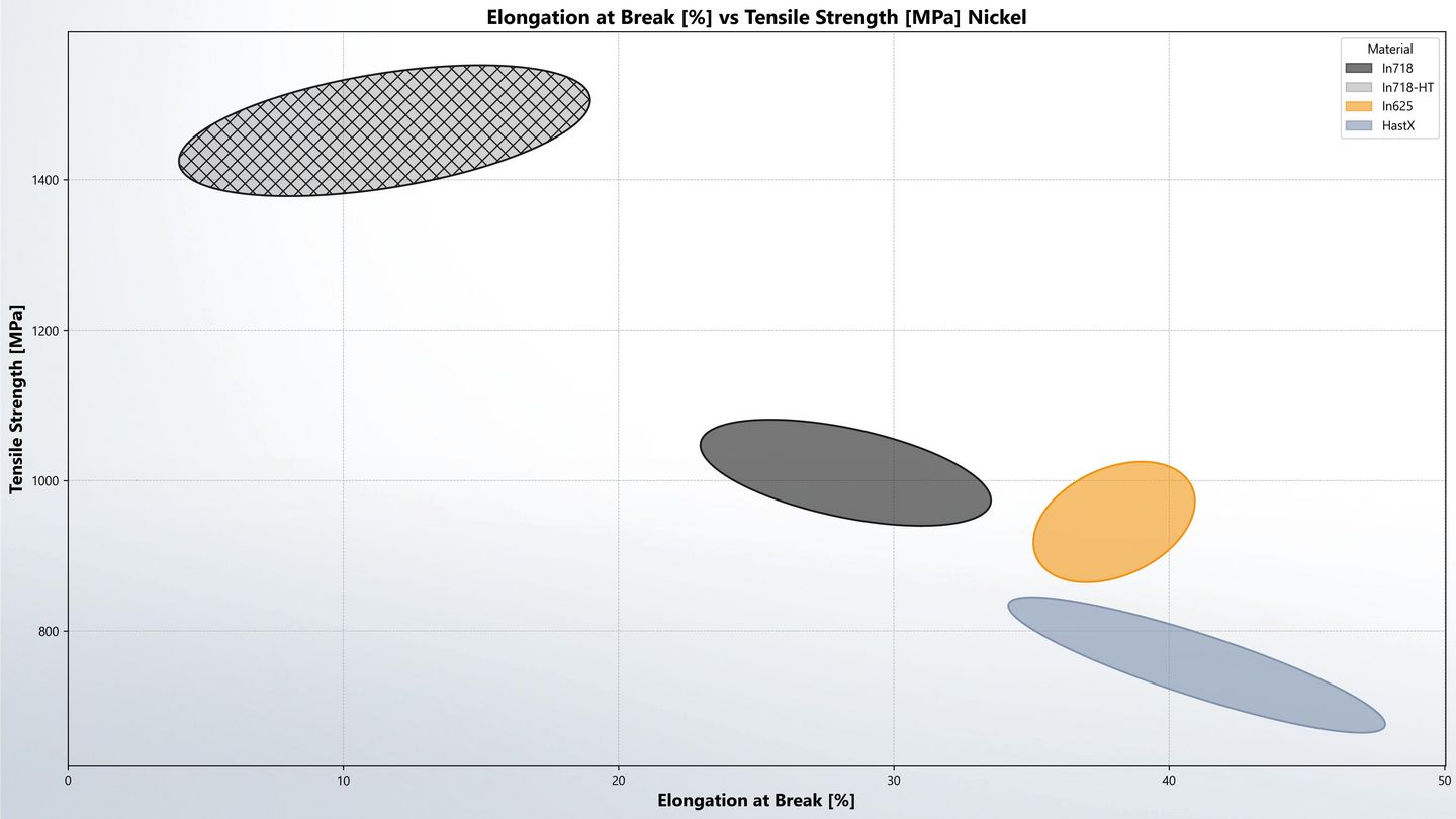 Diagram illustrating the elongation at break in relation to the tensile strength of nickel - a key indicator of mechanical properties in additive manufacturing.