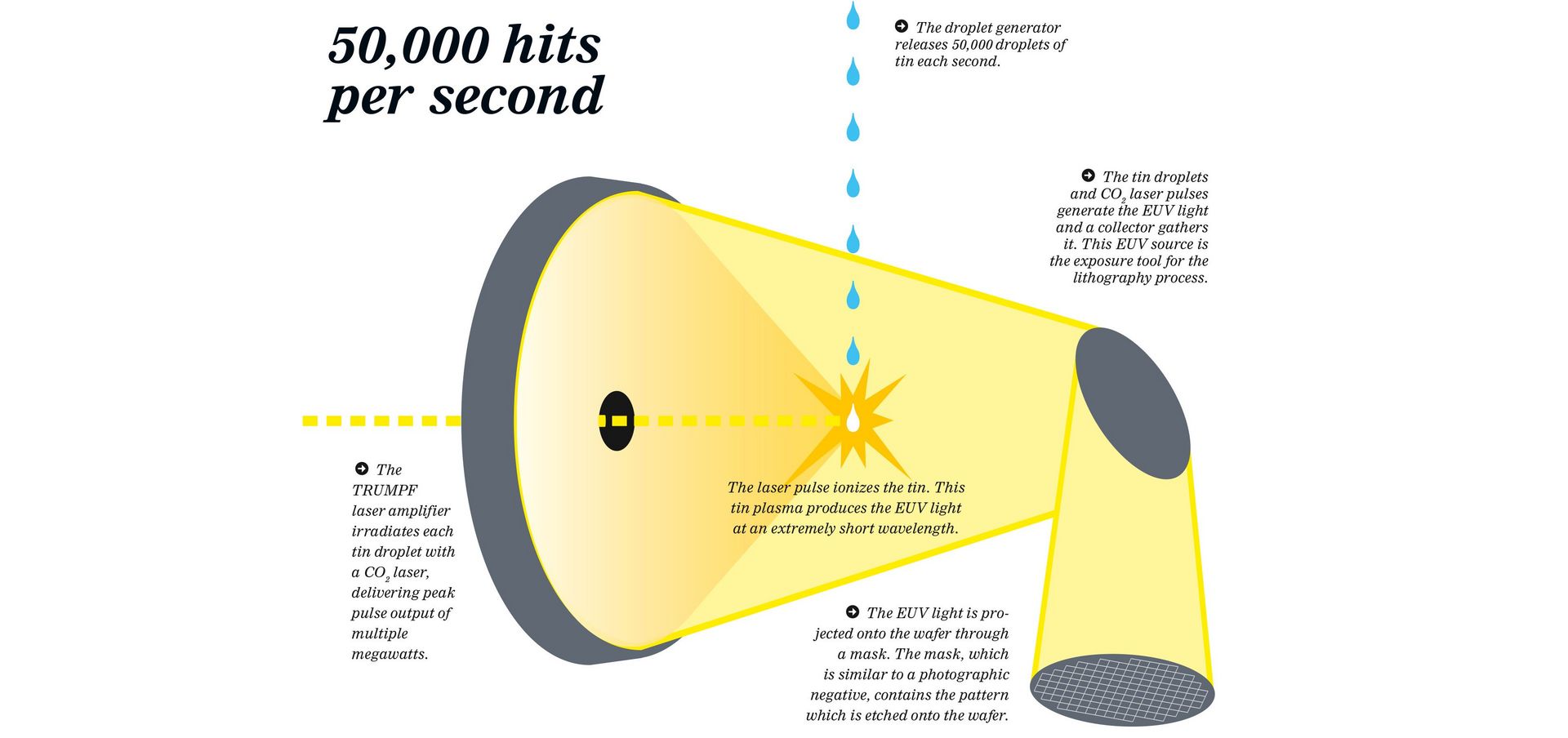 Plasma is generated either by focusing high-intensity laser radiation or with high energy discharges; tin and xenon are suitable for use as the input materials. Laserproduced plasma (LLP) has established a lead here. The idea behind this process sounds quite simple at first. A generator shoots tin droplets with 50-kiloherz into a vacuum chamber while a laser pulse impacts those droplets as they speed by.
