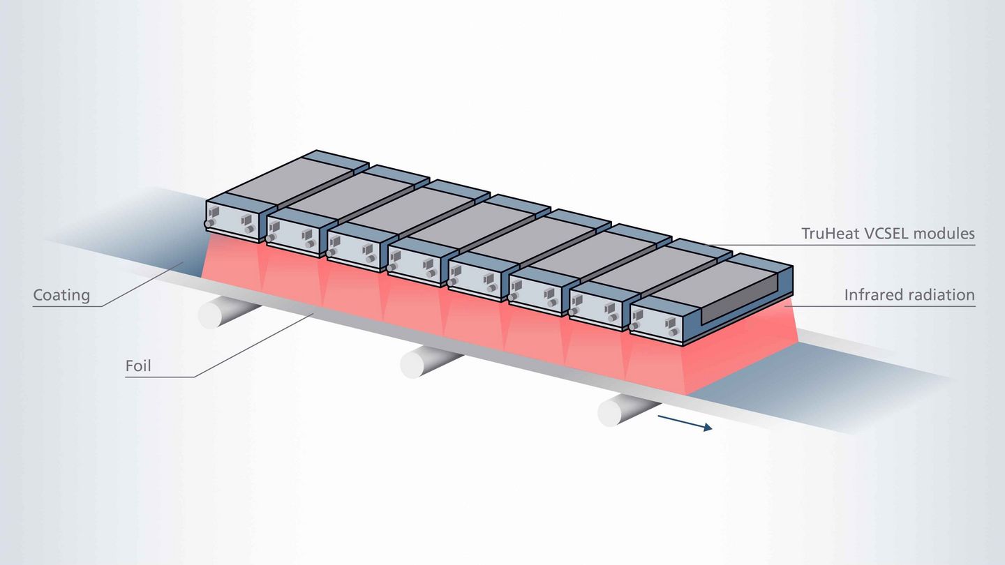 The TruHeat VCSEL laser heating systems have a modular design with separate zones. This enables the precise control of individual illumination zones to support not only optimal homogeneity but also the customization of intensity profiles, for example, a lower or higher intensity at the edges of the coating. Another unique property of the TruHeat VCSEL modules is their compactness and the low working distance. This enables easy integration, even in existing lines.
