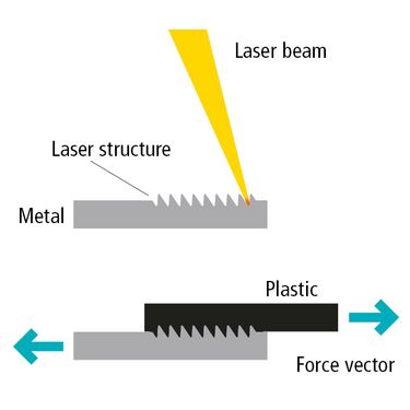 The laser again plays two roles. Acting as a “bonding agent,” high-performance nanosecond lasers pre-structure even large-scale adhesion surfaces – creating undercuts, for instance, by raising areas before material is cast around the component or a thermoplastic is injection molded. As a joining tool, laser light can heat up the metallic part along the seam — directly or by the transmission method — so that the plastic part melts and sticks.