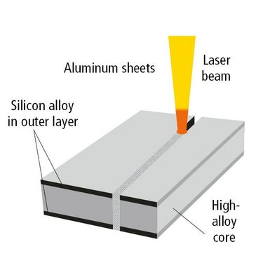 Aluminum and steel cannot be welded by conventional means. Using laser technology, however, makes it possible to create a solid lap joint. The laser fuses the steel in the focus of the beam, and the molten material heats up the aluminum beneath it. When it hardens, the steel forms a bond with the aluminum that is similar to brazing.