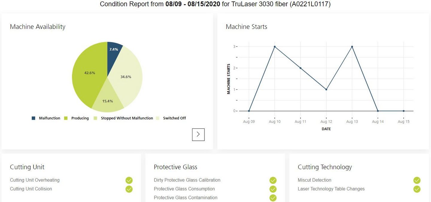 Get Transparency on the operation and maintenance of your TruLaser. Identify the causes of cutting unit collisions and miscuts in your organization, detect contamination issues with protective glasses to improve cutting quality, uptime and longevity of your TRUMPF equipment.
