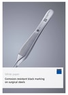 Black marking creates permanent, deep-black, and corrosion-resistant markings. This is due to extremely short laser pulses causing very little heat-affected areas, so that enough free chrome remains on the surface for a self-healing oxide film to form. Download our whitepapers to learn more about the importance of UDI-compliant laser markings.