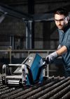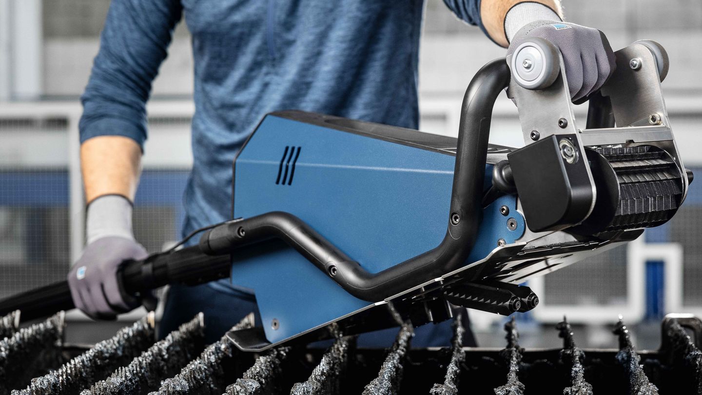 The intuitive handling is further enhanced by the front handle, which allows the machine to be easily placed on the pallet for cleaning. Position markings on the housing cover and handle help operators find the position of the slat to be cleaned. The polyoxymethylene roller is highly practical, as it is used to transport the slat cleaner to the laser cutting system. The roller does not need to be removed before starting to clean the slats.