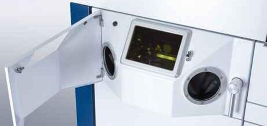 L'imprimante 3D peut être dotée, en option, d'une boîte à gants pour laquelle la porte de la chambre de traitement classique est remplacée par une porte comportant des prises à gants. Cela permet de déballer les composants sous atmosphère protectrice.