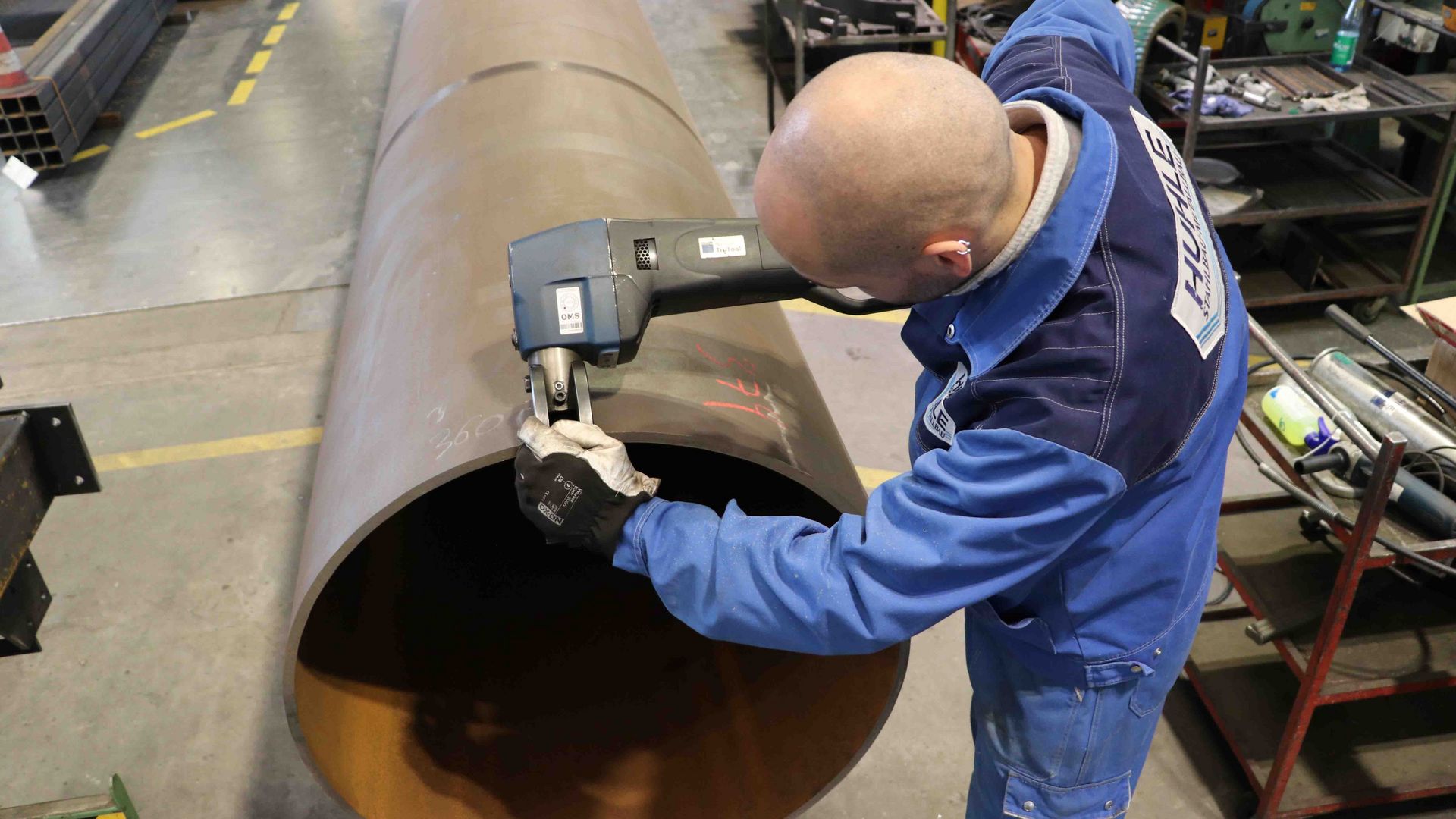 TRUMPFベベラーTruTool TKF 1500を使用することで、同社では要求されている表面品質をそれ程苦労することなく素早く確実に生み出せるようになりました。この機器で生み出されるエッジは、形状が均一で金属被覆がなく、後処理が必要ありません。その結果、Huhleでは加工速度が他の方法より何倍も速くなり、強度が極めて高い完璧な溶接シームを生み出す上で最高の前提条件を整えられるようになりました。セバスティアン・ファイラー氏が指揮するチームの従業員は、既に2016年中盤からTRUMPF工具を使用しており、現在ではべべリングの約90パーセントを同工具で行うようになっています。唯一、TKF 1500の対応範囲を超える (面取り長さが15ミリメートル以上の) 非常に大きな面取り部だけは、据付型装置で切削又は鋸加工しています。以前は頻繁に使用されていた切断トーチとアングルグラインダーは、現在Huhleでは使用されなくなっています。