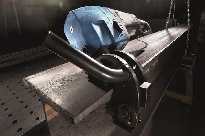 Kionタワーの建設では、窮屈な姿勢での作業を強いられることが頻繁にありました。重量16.5 kgのTKFは軽量工具ではありませんが、人間工学に基づいた構造になっているため、その重量の割には取り扱いやすくなっています。一度配置すると、同機は2 m/分の加工速度でほぼ自動的に材料を加工していきます。その後、Huhleの有資格技術者は後処理を行うことなく、鉄骨構造を極めて高い接合強度で溶接することができました。トッププレートなどの小型部品を加工する場合、この機械はホルダーにしっかり固定することも可能です。その場合、Huhleの溶接技術者は加工品を手に取って、それをこの工具に通していきました。加工する板金やプロファイルが大きいか重い場合は、上記とは反対の方法で作業が行われ、 作業者はTKF 1500を使って加工することになります。この工具はパビリオン用に、複数ある長さ8メートルの円の切片に、常に200ミリメートル間隔で長さ200ミリメートルの溶接シームを施す必要があった場合にも威力を発揮しました。この機器はどのような箇所にも簡単に配置して取り外すことができ、加工速度が極めて高いため、一人の作業者が数時間以内に144箇所でべべリングを行うことができました。