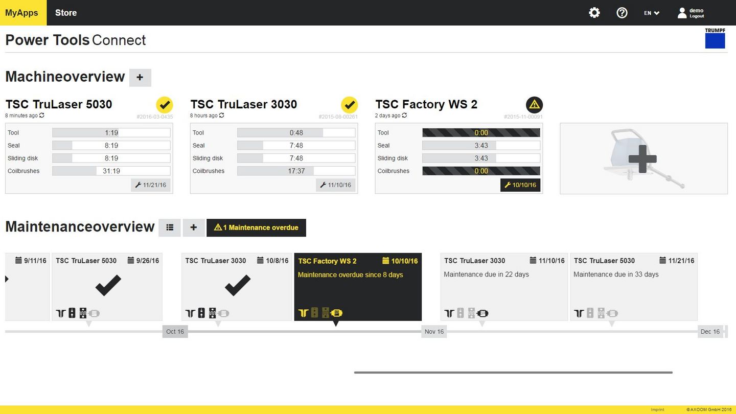 TRUMPF is represented with an app study for the slat cleaner TruTool TSC 100. This power tool reports usage data to AXOOM via a wireless connection. The user receives information about the operating hours of the cleaning tools, seals and carbon brushes via mobile terminals. He knows when maintenance is due, and can intervene quickly to avoid expensive shutdowns. Employees perform maintenance work correctly and rapidly, supported by instructions and videos available on smartphone or PC. The automated maintenance intervals ensure better machine maintenance and longer service life.