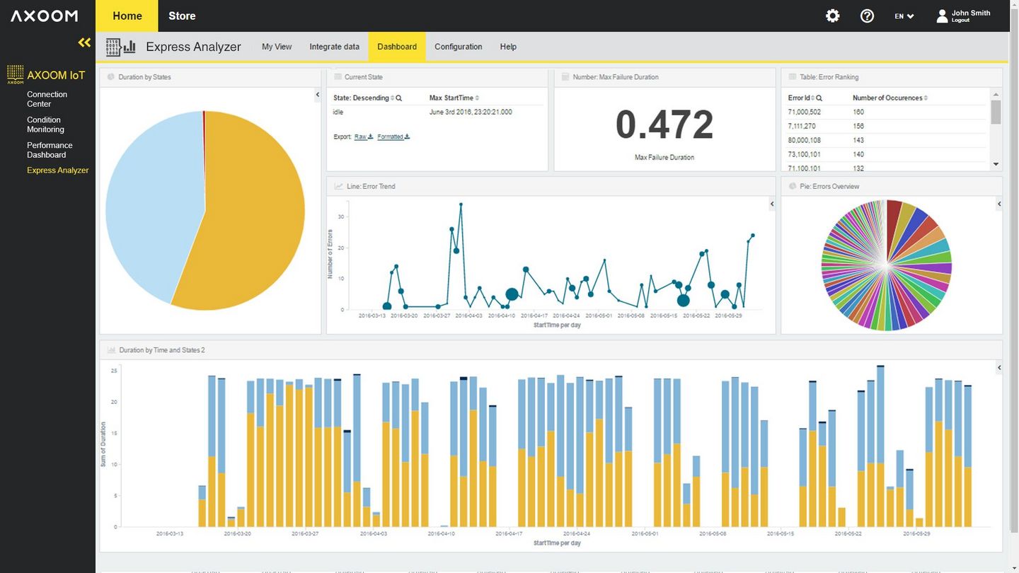 The AXOOM IoT solutions are currently divided into four areas. The Connection Center helps machine manufacturers to connect and manage their devices in the field, in order to improve availability and support. This reduces expensive downtimes for their end-customers. The second area, Condition Monitoring, also offers significant advantages: live status monitoring makes production processes more transparent and predictable for end-users, and machine manufacturers can automatically monitor the behavior of their machines and components. The third area, Remote Services, provides proactive software and machine updates to reduce maintenance costs, and enables configurations, software updates and bug fixes to be carried out remotely. The fourth area, Analytics, provides valuable insights: the analysis of the collected data can help to significantly increase productivity. Machine manufacturers are able to analyze the performance of their plants under real production conditions, and to use the results obtained for product optimization.