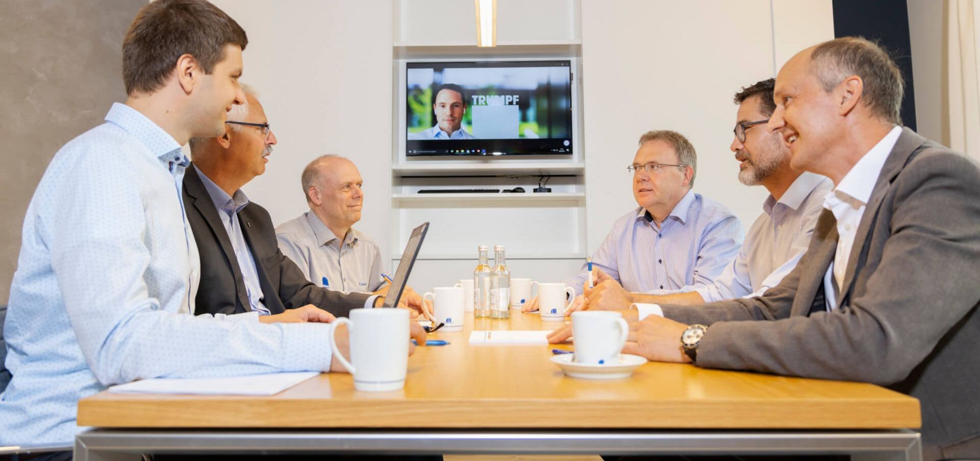 Teamwork was the be-all and end-all in the collaboration between SCHRAG and TRUMPF. Smart Factory consultants Robert Herold (front left) and Dominique Hensel (center back) were able to convince the SCHRAG project team with their expertise in on-site workshops and in virtual meetings.
