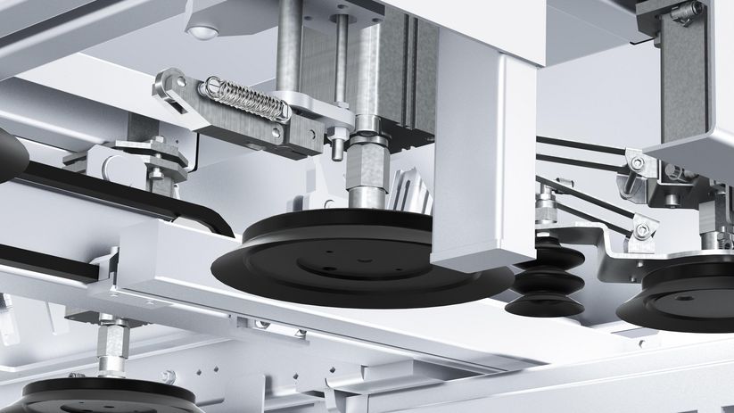 O gancho de descarga recolhe a chapa pronta processada do dispositivo de troca de paletes e a coloca sobre o local de descarga. A estrutura de ventosas está equipada com ventosas individualmente acionáveis que recolhem as chapas brutas do local de carga e as colocam sobre o dispositivo de troca de paletes.